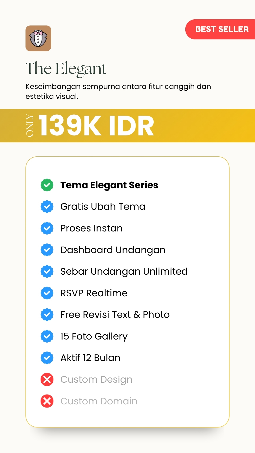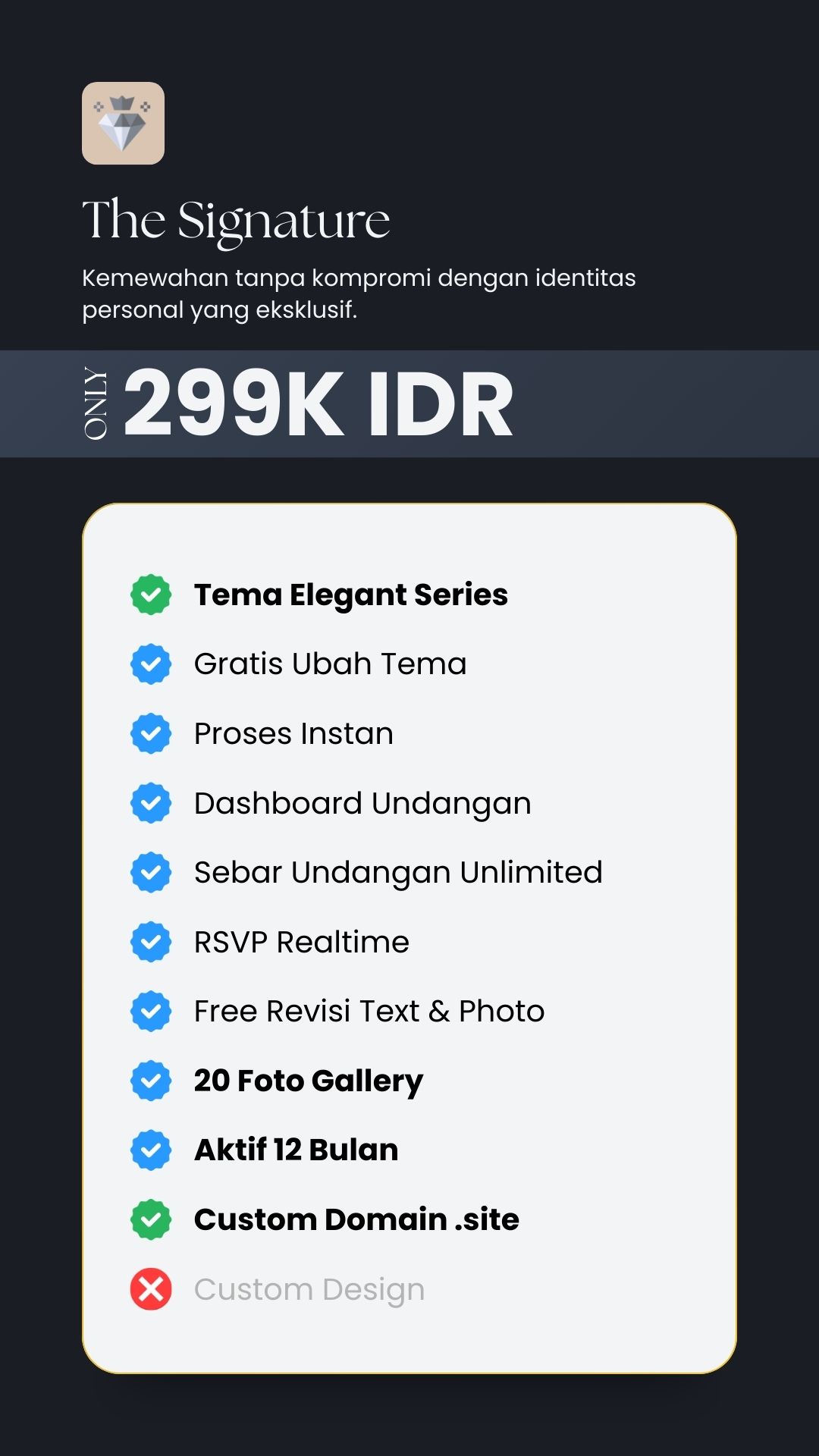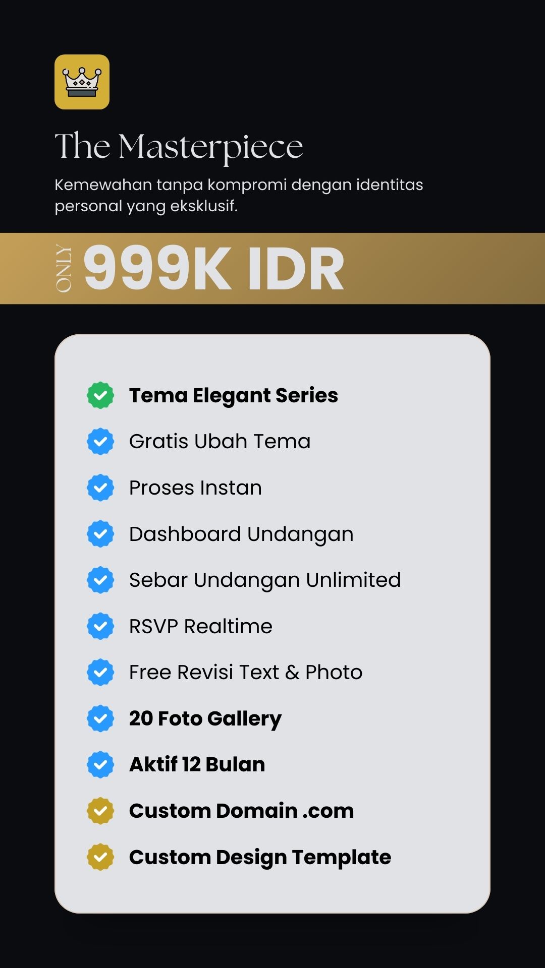 Undangan adalah sapaan pertama bagi para tamu kehormatan. Kami menghadirkan platform undangan berbasis website yang dirancang dengan presisi tinggi, memastikan setiap detail dari tipografi hingga palet warna mencerminkan standar kelas atas pesta Anda.