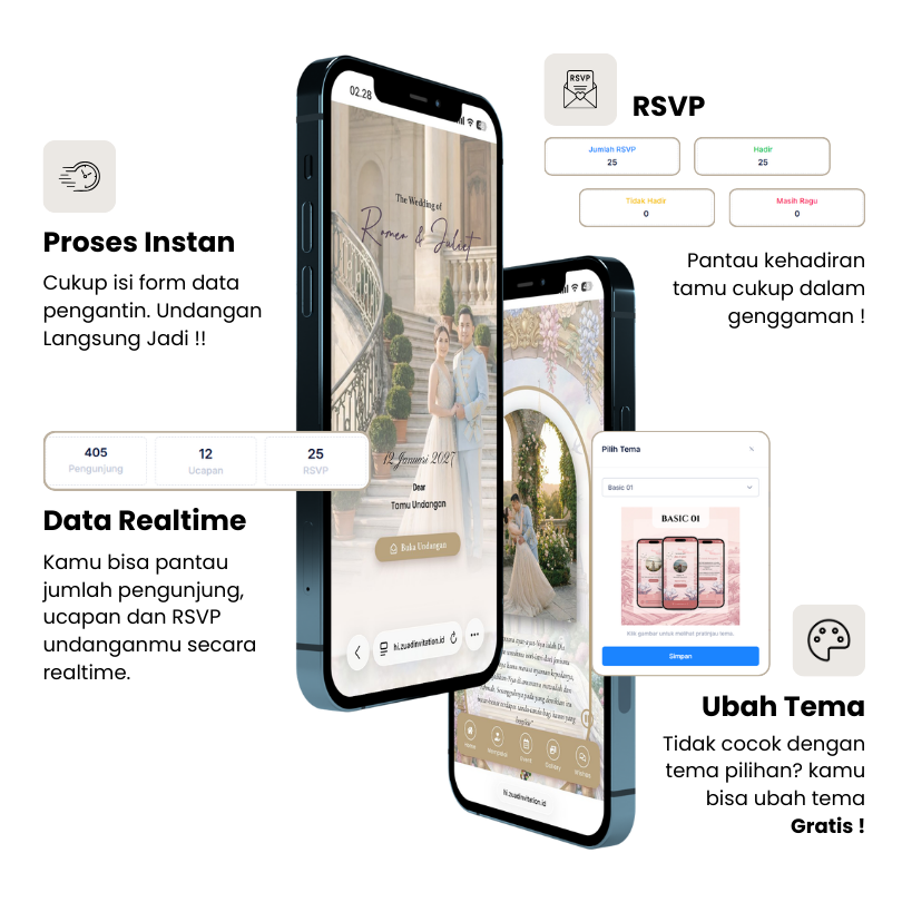 Instan!. Cukup pilih tema, lalu isi data pengantin. Undangan Jadi!!